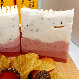 Here is the last of the November soaps!! This soap is inspired by Thanksgiving Day and the awesome food that we have every year. For this soap, I wanted it to smell like apples since having an apple pie is a traditional dessert dish for many people. This is what influenced the design the most. Using red and white only, I created a little ombre effect with the red and added the white layer to make is look a little like an apple. I added poppy seeds to the soap and created a lattice type top sprinkled with a little gold.